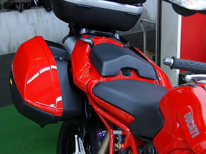 ブラケットの設置が終われば、いよいよケースを装着します。グイッとブラケットにトップケースを押し込み、カチャッ、カチャッと左右のケースをはめ込めば、バードカ号のツーリングトリムが完成。ビーエムも真っ青のリアビューが大迫力です。トップケースを装着した姿はたまに見かけますが、ケース3つを装着したムルティストラーダを見るのは初めてのこと。やはり、見た目にはリア周りが相当重たそうですが、これで積載量と利便性が爆発的にアップすると考えれば、全く後悔はありませんでした。