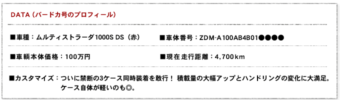 やはりフツフツと湧き上がってくるブツヨクには勝てず、とうとうオーダーしてしまったのです、あの豪華3点セットを。そう、どうしても欲しくなってしまったトップケースとサイドケースのことです。スリムさがウリのドゥカティに、ケースを3つも同時装着するなんて人はあまりいないと思いますが、ケース類を装着すれば、ツーリングに、買い物に、日常のゲタ代わりに、とバードカ号とがもっと便利に使えるはず。しかも、トップとサイドのケースを同時装着できるのはドゥカティの中でもムルティだけに与えられた特権。飛躍的に積載量をアップして、ロングツーリングに出かけるのも夢じゃないということです。さらに、最近分かってきたのですが、案外バードカ号は燃費優等生。私の使い方だと、コンスタントにリッター20km以上は走るので、車で渋滞の中をチマチマ走るよりも、荷物を積めるようにして、できるだけバードカ号で出かけるようにした方がずっとエコ…。まぁ、自分のブツヨクを正当化する理由はすぐにた~くさん思いつくわけです。