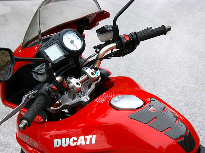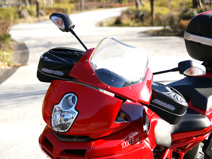 では、早速パッケージを開けて装着です…と言っても作業自体は非常にイージー。ハンドル挿入部を開いてカポッとはめたら、4枚のネオプレーン製ベルトを順番通り巻きつけて、ベロクロを圧着するだけ。左右装着するのに5分もかかりません。念入りに取り付ける場合は穴を開けてグリップエンドのボルトで共締めする方法もあるようですが、今回はお手軽取り付けということで省略しました。ムルティストラーの場合、ハンドルをフルに切ってもカウルとのクリアランスが変化しないので、ハンドウォーマーとの干渉もなし。ユニークなカウルが意外なところでメリットとなりました。