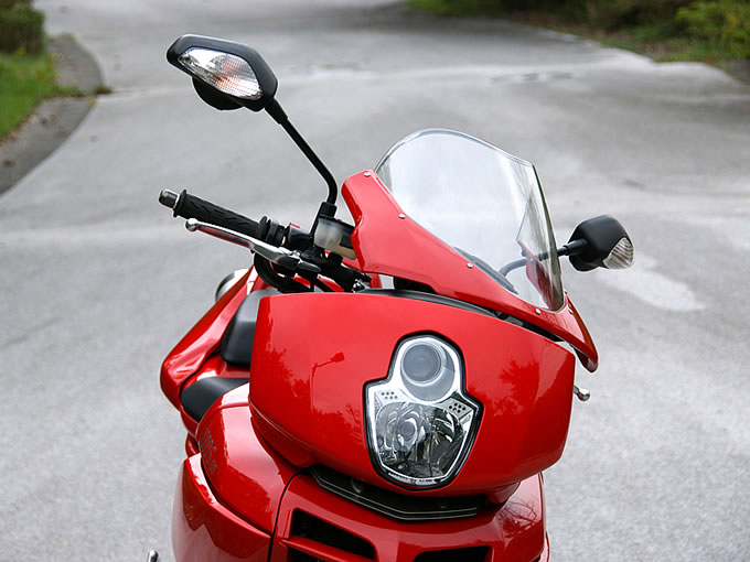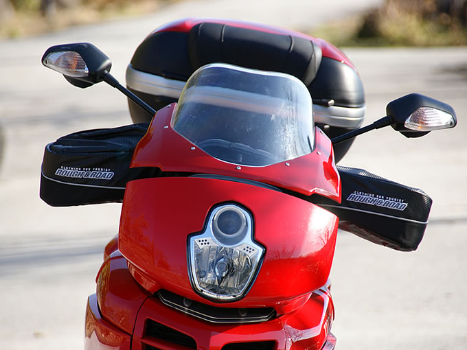 さて、このように買い物にも使える実用性を与えられたバードカ号ですが、この季節になるとどうしても気になることがあります。それは寒さ。空力特性とスタイル、そして十分なハンドル切れ角の確保を目的として、ウインドスクリーン部分のみをハンドルマウントとしたユニークな構造のカウルですが、正直言ってウインドプロテクション性能はイマイチ。特に、小振りなアッパーカウルのサイドを通過する走行風がハンドルグリップ周辺を直撃してしまうので、手の寒さを感じやすいという問題があります。寒さのピークはまだこれから。でも、サイドパニアとトップケース装着という贅沢をした後だけに、高価なグリップヒーターはちょっと…。