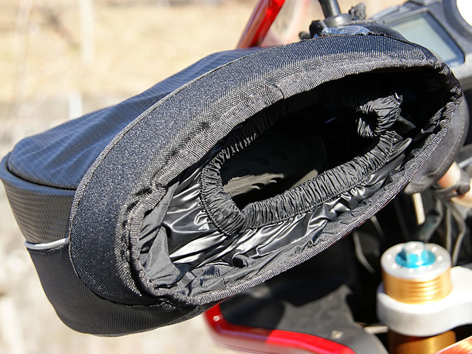 これが効果抜群で、手放せなくなってしまいました。アッパーカウルの両サイドを激しく流れる走行風から完全に防御され、手元に感じていた寒さが激減。この真冬でも3シーズン用のグローブで十分走れます。私のように、厚手のウインターグローブのフィーリングが嫌いで、ギリギリまで我慢してしまう方も多いと思いますが、1年を通して薄手のグローブが使えるのであれば、仮に少々野暮ったいと感じたとしても許せるのではないでしょうか。透明窓から中が見えない夜間走行では多少戸惑うこともありましたが、今ではそれもすっかり慣れてしまいました。強い負圧が発生する高速道路では上下からやや押しつぶされる感覚がありますが、内部が広いのでレバーやスイッチの操作には影響しないようです。