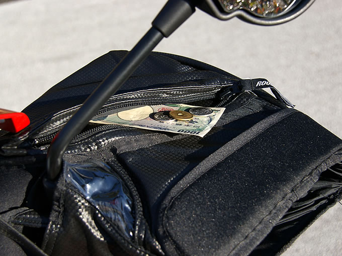 ハンドウォーマーを装着したのは初めてだったので、テスト走行前にしげしげと観察してみると…。手を挿入する開口部内側にはシャーリングが施されたウインドシールドがあり、防風効果を高める折りたたみ式の延長フラップも採用。裏地にはシームテープによる防水加工が施され、腕を伝わって内部に侵入した雨水を排出するドレンホールも装備。さらに、左右の親指周辺はスイッチなどを確認できる透明窓が設けられ、右側には高速券などを収納する大型ポケットがあるなど、防風性や使い勝手は相当考えられているという印象です。そして、実際に走り出してみると…。