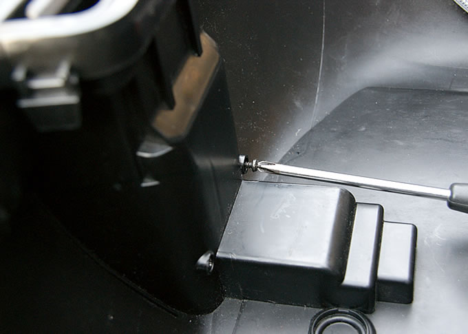 トップケースの開閉機構は裏側2本のビスで固定されているだけ。これを外せば簡単に分解可能です。