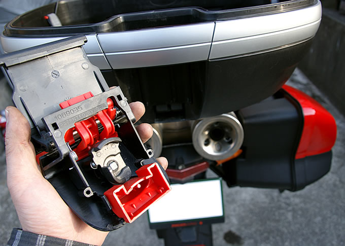 トップケースのキーシリンダー。これをサイドパニアと共通のものに変更すれば鍵は1本でOK!