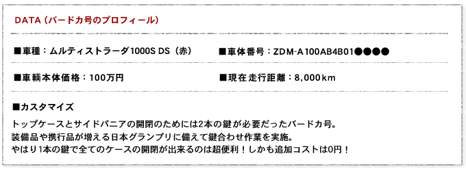 さて、作業後の感想ですが、なんでもっと早くやらなかったのか、と思うぐらい便利。これまではトップケースとサイドケースの鍵を2本持ち歩いていたので、サイドパニアの鍵でトップケースを開けようとしたり、その逆だったりと、1回で鍵が開かずイライラすることも度々。ところが、1本のキーでトップケースとサイドパニアが開くようになったので最高に便利。「ケース3つにレインウエアや傘、ポンチョ、何でも詰め込んで、キー1本で開閉自在! これで天候不順も怖くない!」と思っていたら、それが日本グランプリで現実になってしまいました。トホホ。