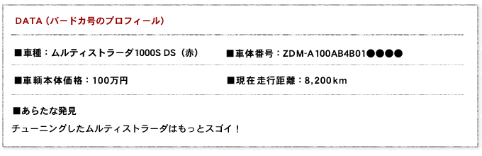最近、「貸してくれ」と他の編集部からの引き合いも多く、走行距離もグングンと延びているバードカ号。長期テスト車両として購入を決めたときには「なぜムルティストラーダなんだ」とよく言われたものですが、走行距離が順調に延びているのは、ムルティストラーダが良いバイクである証。イタリア車独特の艶を持ち、速くて便利で、なにより快適。こんなバイクが悪いはずもなく、、購入決定者としては「してやったり」という感じです。そんなツルシの状態でも十分すばらしいバードカ号ですが、少し前にもっとすばらしいムルティストラーダに試乗することができたので、今回はそのご紹介をしましょう。それは国内外のバイクチューニングで有名なAMSフジイが仕上げたムルティストラーダ1000DSです。