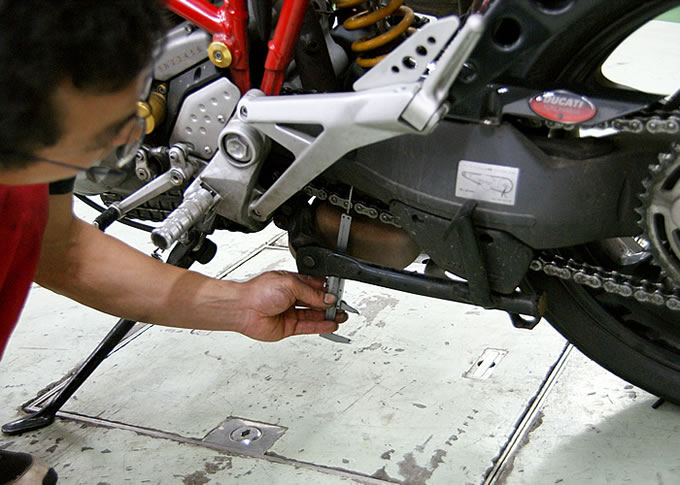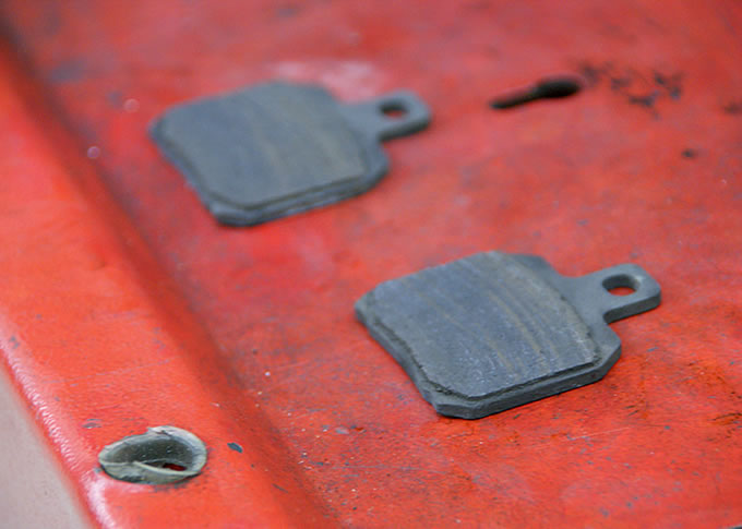 ということで今回は、エンジンオイルおよびオイルフィルターの交換、リアブレーキパッドの交換というメニューで入庫です。リフト上のバードカ号はササッとドレンボルトが外され、使い倒されたオイルを落としながらリアブレーキパッドの交換です。で、外されたブレーキパッドですが…これがもうホントに「寸留め」状態。残量は1ミリもなく、まさに使いきる寸前でした。担当してくれたメカニックの方から「上手く使いましたね」という、皮肉ともお褒めの言葉ともつかない微妙なコメントを頂き意気消沈。