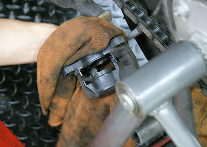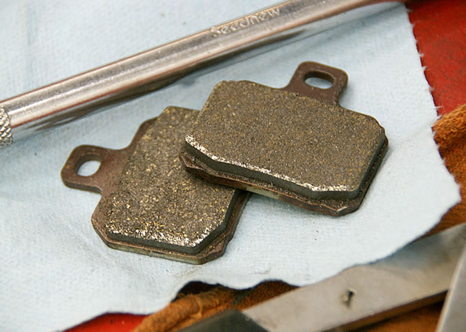 気になるポイントというのは、リアのブレーキパッドがもうペラッペラだったこと。もともと私はリアブレーキの使用頻度が高いうえに、街中走行も多いのでリアのパッドの減りもハンパではないのです。ということで、フロントブレーキのパッドはまだまだタップリ残っているというのにリアは早々と交換のタイミングを迎えていたのです。ところが…リアのパッドがペラペラなことはちょっと前から認識していたのですが、できればエンジンオイルの交換のときにいっしょに…と姑息なことを考えているうちにタイミングを逃してしまっていたのです。そうこうしているうちにバードカ号の出番が激増。パッドを完全に使いきってしまう恐怖に耐えながら乗っていたのでした。(←こういう愚かなことはマネしてはいけません。)