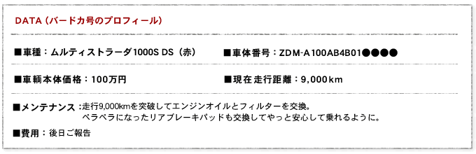 さてさて、あっけなく走行距離9,000kmを突破したバードカ号。前回のエンジンオイルの交換は積算計が5,300kmのときですから、あっという間にオイル交換の時期となりました。実は今回、オイル交換以外にも非常に気になるポイントがあったので、今回はその対応も含めての入庫です。