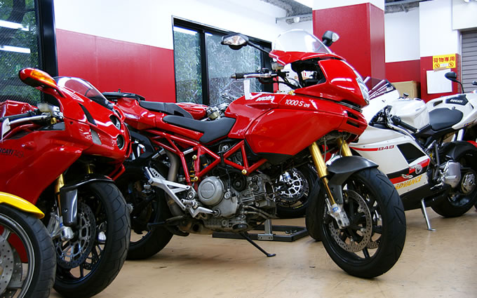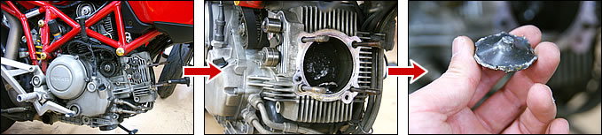 「ヤバ過ぎる!」と思いつつ、手元のキルスイッチを誤操作していないか確認するも正常位置。しかし、セルボタンを押してもエンジンが復活する兆しナシ。「どーする、俺?」と考えても惰性で走りながら路肩に寄せることぐらいしかできないのですが、事件現場はトンネルの中で路肩がない。バイクも人間も絶体絶命の危機!と思ったちょうどその時、非常電話が設置されたエスケープゾーンを発見。惰性走行でどうにか滑りこむことに成功したのでありました。で、現在はいつもお世話になっているドゥカティ横浜のバックヤードで療養中のバードカ号の姿がコレです。