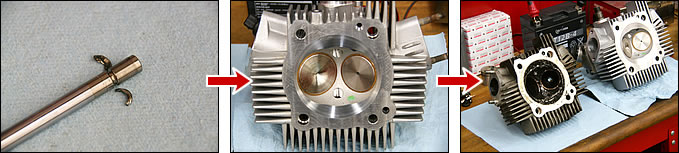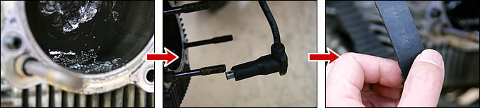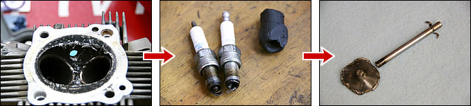 さて、取り外されたシリンダーヘッド側はというと…さらに悲惨な状態。燃焼室上部はほぼ満遍なくキズだらけで、装着されていた2本のプラグの電極部分はぶっ飛んでいたりひん曲がっていたり…。折れたステムと千切れていたプラグコードの先端はこちらにありました。しかし、ナゼこいつが千切れたのかがやはり気になるところ。プラグコードが千切れてブラーンとすれば、何かの拍子にベルトとギアの間に噛み込んでタイミングがズレてしまうことも考えられるし…はたまた、こいつが千切れていたということは、2本のプラグのうち1本は機能していなかったわけで、それがこの一大事を引き起こしたのか…。ナゾは深まるばかり。