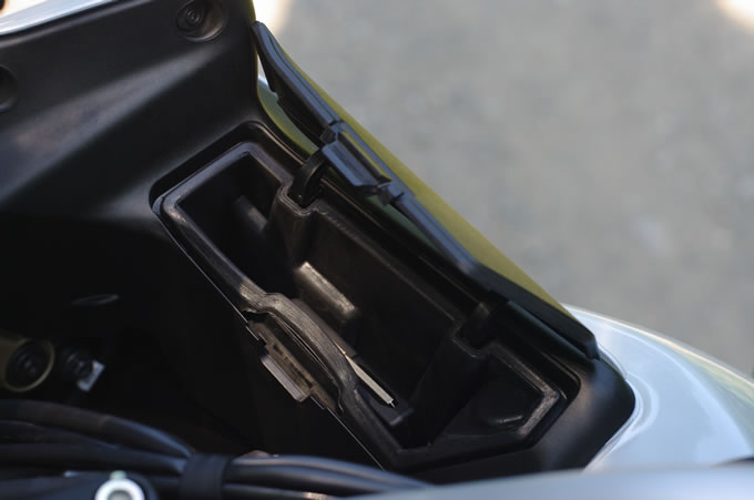 また、前後足回りの変化も絶妙。乗り心地もソフトなアーバンモードからダンパーをギュッと締め上げたという感触で、良好なロードホールディングを実現しつつ居住性も快適だと感じました。一方、新型に関してちょっとした注意点も。実は高速道路に入る直前、カメラやマイクのセッティングを調整するために停車し、パニアケースおよびタンデムシートの開閉を行ったのですが、高速道路走行中にメインキーをシート下のキーシリンダーに挿しっぱなしだったことに気付いたのです。新型はメインキーと車体が無線通信することによりエンジン始動が可能となるキーレスシステムを採用しているのですが、その関係でメインキーをパニアやシート下のキーシリンダーに挿入したままでも走行できてしまうのです。この状態で走行を続ければ振動などでメインキーを落としてしまう可能性もあり要注意です。私の場合は走行中にインジケータに表示された“NO KEY”の表示を見てサービスエリアに飛び込んだので事無きを得ましたが、何れにしても注意が必要です。