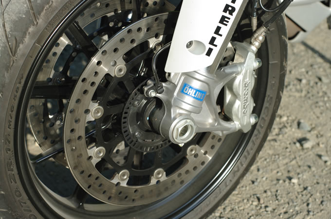オンロード向けの前後ブレーキだが、意外にもオフで使いやすい。ローターをヒットさせない配慮は必要だが…。