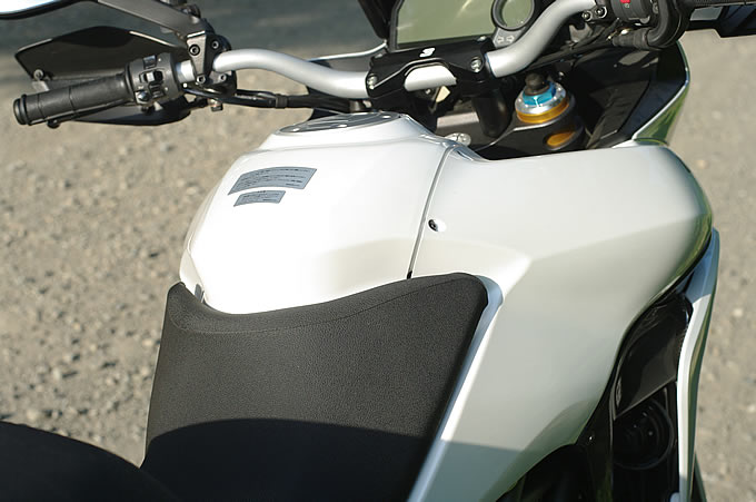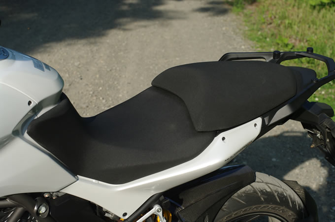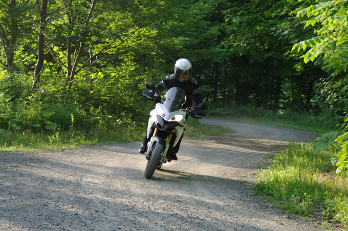 前傾姿勢が強いモデルはフロントの荷重がどうだとか、ブレーキングがどうだとか、いろいろ難しいことを考えながら走らさなくてはなりませんが、新型ムルティならそういうことは全く関係なく楽しめてしまうのです。もちろん、そうしたテクニック的なことを追求しながら走れば、より速く走行することが可能ですが、そうしなくても十分に速い。荷重の移動に対して素直に車体が反応してくれるので、ノーブレーキでクリアできてしまうコーナーも結構多いのです。また、低回転から十分なトルクが立ち上がるので脱出もスピーディ。こうしたキャラクターはちょっとBMWのGSに似ていますが、それでもシャープさは新型ムルティの方が数段上だと感じました。ツアラー的なバイクではありますが、さすがドゥカティ、飛ばすことの楽しさを忘れちゃいませんね。もちろんブレーキ性能も余裕たっぷりという印象でした。まあ、ここはドゥカティの得意分野なんでね…。