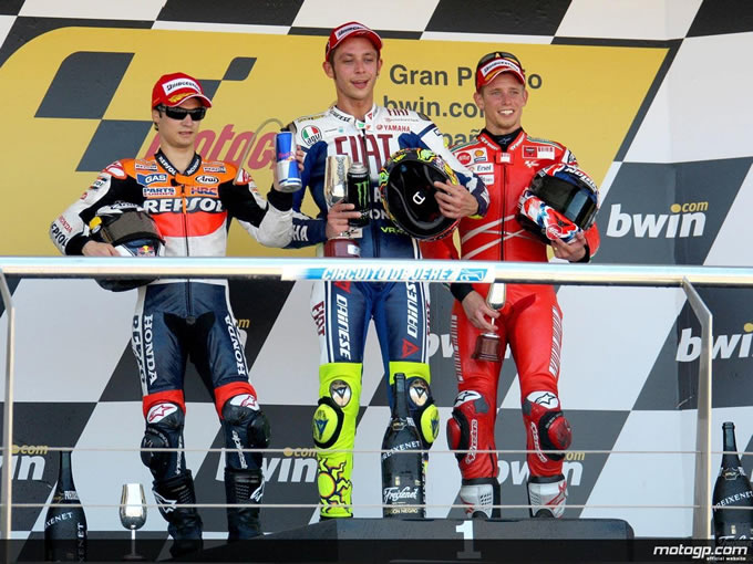 レース開始直後から、ストーナー、ペドロサ、ロッシで先頭グループを形成。ストーナーはペドロサの後につけ2番手となっていたが、6週目にロッシにパスされ3位に後退してしまう。その後も果敢にアタックを繰り返すが及ばず、そのままポジションをキープしてチェッカーを受けた。優勝こそ逃してしまったものの、苦手意識の強かったヘレスサーキットでの上位入賞は彼とドゥカティの実力を十分に感じさせるものだ。また、ストーナーにとっては2002年に世界へ挑戦をはじめてから、ヘレスでは初の表彰台。ポイントスタンディングではロッシに続く2位に浮上しており、2007年と2008年チャンピオン同士の争いが加速しつつある。対するヘイデンはカタール、もてぎと2戦連続で続く転倒の影響を引きずっており、残念ながら15位でのゴールとなった。ヘレスではこれまで好成績をおさめていただけに、序盤戦での負傷やトラブルが惜しまれてならない。