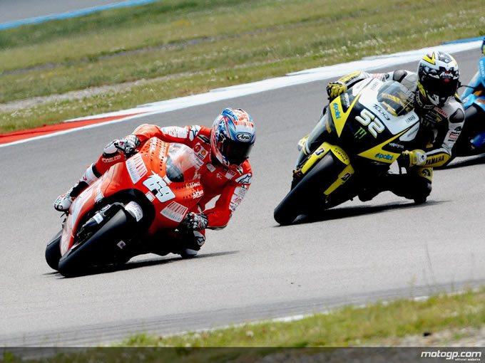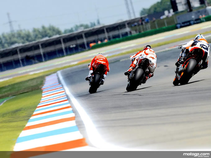 この1周4.555kmのアッセンサーキットで行われた戦いが、これまでになく波乱に満ちたものになることを誰が予想できただろうか。レース開始早々、2番手のポジションで好スタートを見せたホンダのペドロサが転倒。そのチームメイトであるドヴィヅィオーソも11周目で転倒しリタイヤとなり、トップグループの常連たちが消滅するというアクシデントが発生した。また、中盤グループでもプラマックレーシングのカリオがクラッシュするなどのトラブルが続く。そんな中、ヤマハ勢がトップを独占し、その後をストーナーが追うという前回のカタルニヤGPと同じ展開となり、またしても他を引き離していった。結局そのままロッシ、ロレンソ、ストーナーとチェッカーを受け、全く前回と同じ表彰台が再現されたが、ロレンソとの差は20秒近く。とはいえ、前回に続き体調がすぐれないままレースに臨んでいたストーナーは思うようにタイムが上がっておらず、終了後のカンファレンスにも姿を見せないほどだった。そんなコンディションの中、今回も3位表彰台を死守した底力には驚きを禁じえない。