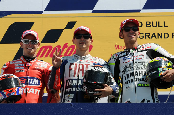 ドライコンディションでスタートした決勝レースは、スタートで先頭に飛び出したペドロサを先頭に、ロレンソとストーナーが追随する形でスタート。3台が形成するトップグループは後続を突き放してエキサイティングなバトルを展開するが、中途でペドロサが転倒して脱落し、ロレンソとストーナーの一騎打ちとなった。しかし、セッティングがパーフェクトでなかったストーナーは1分22秒前半のペースを保持し、ノーポイントを避けて完走すること選択。ロレンソに優勝を許すものの2位表彰台を獲得し、ポイントランキング3位のドヴィツィオーゾまであと3ポイントまで詰めることに成功した。ランキングトップは遠いが、このままのペースでいけばホンダ勢と逆転することは決して難しくはないはずだ。ただ、来シーズンはそのホンダで走ることを考えると、一抹の寂しさを感じさせる。