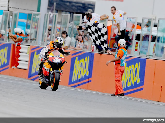 レースは序盤から好調なペドロサが1分34秒台のコースレコードを連発しながら後続を引き離しにかかる。こうなるともう誰も手をつけられず、注目は2位争いに。3番手のストーナーは前を行くロレンソに食らい付こうとするが、いまひとつマシンの動きにキレがない。10周目には逆に4番手につけていたロッシにコーナーでインを刺されるが、次のコーナーでは逆にインを突くというクロスラインの応酬。さすがはモトGPチャンピオン経験者同士の2人。露骨なまでのプライドの激突で中盤での見せ場を作ってくれた。その後、後方から驚異的なペースで追い上げてきたアンドレア・ドビツィオーソにもかわされ、ストーナーは5位でフィニッシュ。やや控えめなウィリーでゴールラインを駆け抜けた。