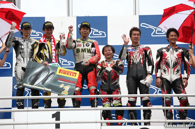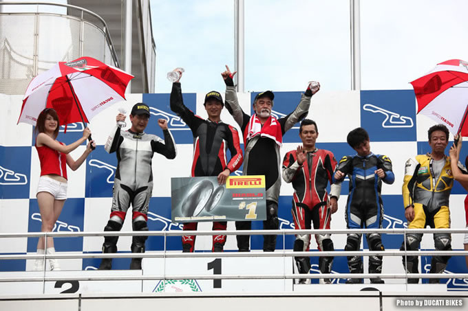 14ミドルクラスで表彰台に立つ、ドゥカティバイクス編集長ナガヤマ。