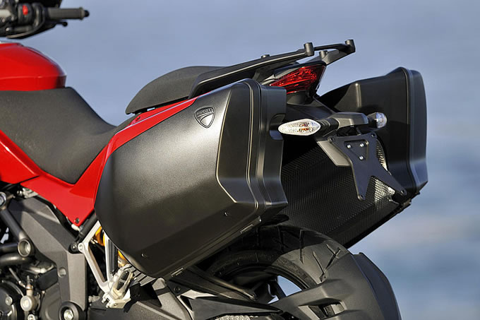 03ムルティストラーダ1200S ツーリングエディションに標準装備されるパニアケース。マフラーがシート下から車体右下に移動したため、リア回りの収まりが良い印象。