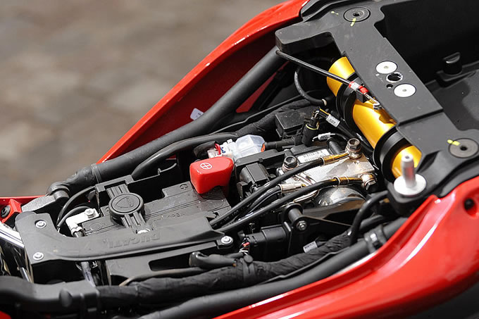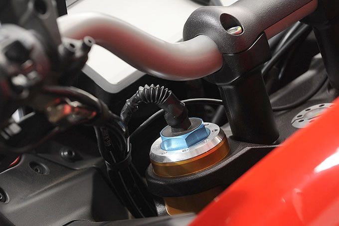 06オーリンズ製のDES(ドゥカティエレクトロニックサスペンション)を調整するために、アクチュエーターと接続されている。