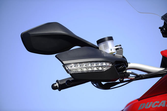 09ムルティストラーダ1100/1000のウィンカーはミラー内蔵式だったが、ムルティストラーダはハンドガードにLEDウィンカーが埋め込まれている。
