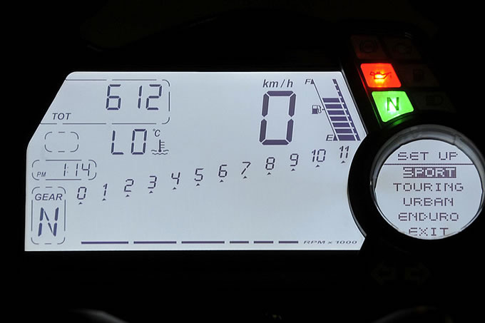 11メーターはアナログ要素ゼロ。液晶ディスプレイに各種情報が表示される。右下の丸型ディスプレイはモードセレクトやセッティングなどで使用する。
