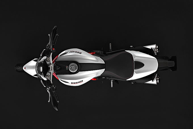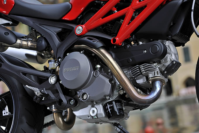 気になるスペックの方だが、心臓部には新開発のデスモデュエ796エンジンを搭載し、スイングアームは上位モデルであるモンスター1100を踏襲した片持ちタイプを採用。現在発表されている諸元値はイタリア本国仕様のものだが、新型エンジンだけにハイパーモタード796同様に、国内仕様とのスペックに大きな差が無いと予想される。 今回は秋の発表に先駆けて、ディティールカットから走行シーンまで、モンスター796の画像をピックアップしてお届けする。まずは各部をじっくりと確認して欲しい。