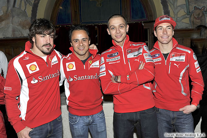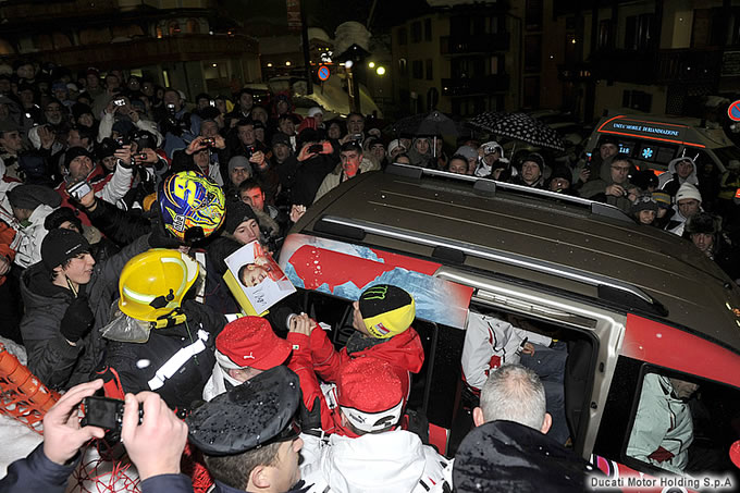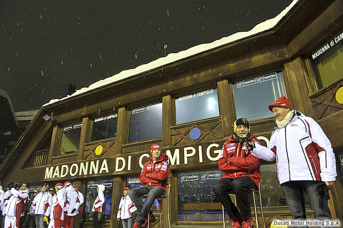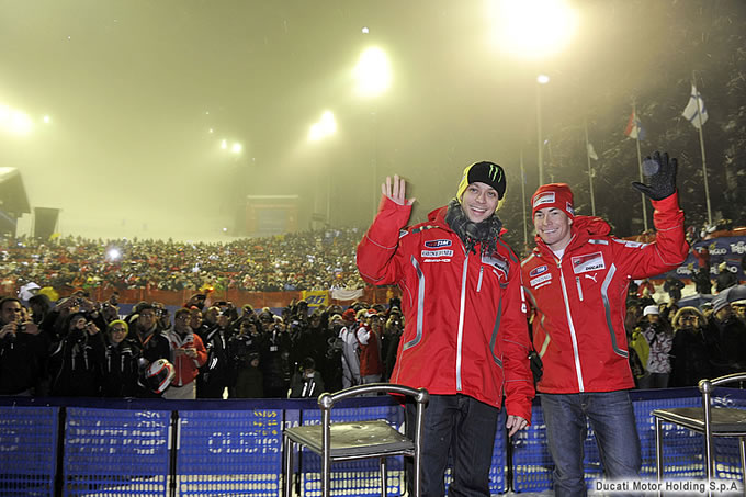ドゥカティとフェラーリの共通スポンサーであるマールボロ社が主催する恒例のイベントWROOOMが今年も開催された。このイベントは、ドゥカティおよびフェラーリの新チーム体制を発表するもので、イタリアのマドンナ・ディ・カンピーリオという雪山を舞台に行われている。例年ではF1とmotoGPの世界的スター同士による夢のツーショットや、スキーや氷上レースなどのイベントに注目が集まるが、今回の目玉はなんといってもバレンティーノ・ロッシ。2009年に世界王者を獲得したヤマハを抜け、2011シーズンはDUCATIのシートに跨ることになり、世界中から注目を集めているのだ。ドゥカティコルセ(レース部門)からリリースされた、プレス用フォト全画像をお届けしよう。