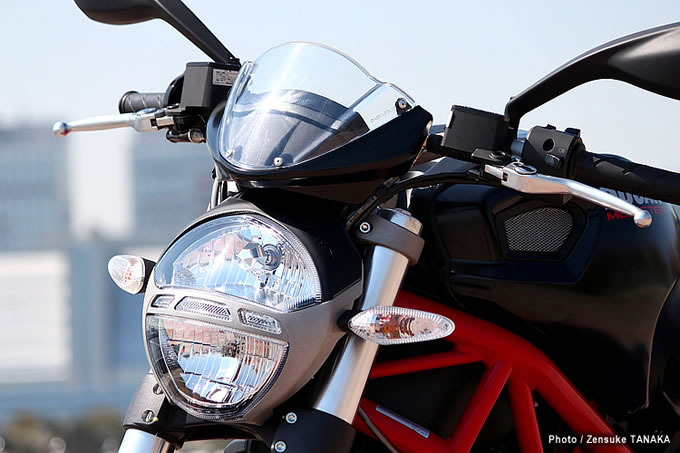 上下に分割されたヘッドライトは現行モンスターシリーズのアイデンティティ。ロービームで上段が点灯、ハイビームおよびパッシングで下段が同時に点灯する。小型のメーターバイザーを装備するが、高速域ではこれがけっこう効いてくる。