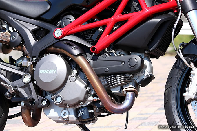 01昨年デビューしたニューモデル、ハイパーモタード796に搭載された新開発の空冷2バルブL型2気筒エンジンがベース。排気量は803ccで軽量化されたクランクケースや848系の軽量フライホイールを採用。エンジンが剛性メンバーの一部を兼ねているのがドゥカティの特徴。