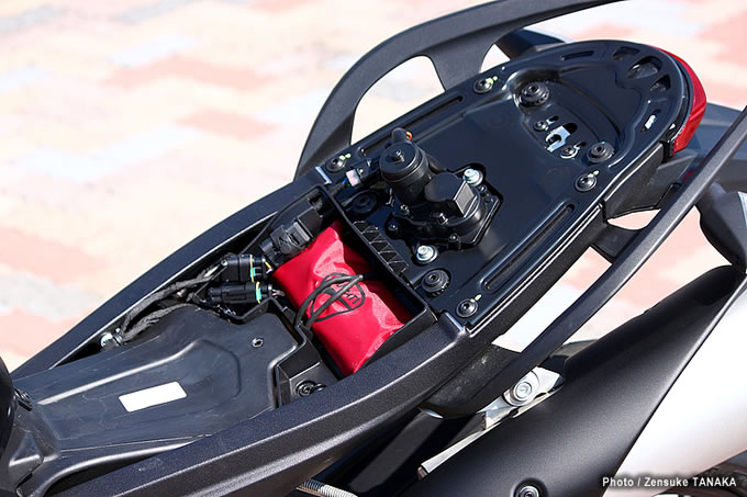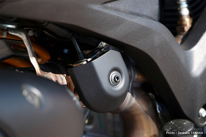 10シート下のスペースはわずかで小さな車載工具程度しか収納できない。アルミ製サブフレームにはタンデム時に心強いアクセサリーグラブハンドルを装着できる仕組みになっている。サイレンサーのヒートガードも現行696同様、樹脂製の大型タイプが装備される。