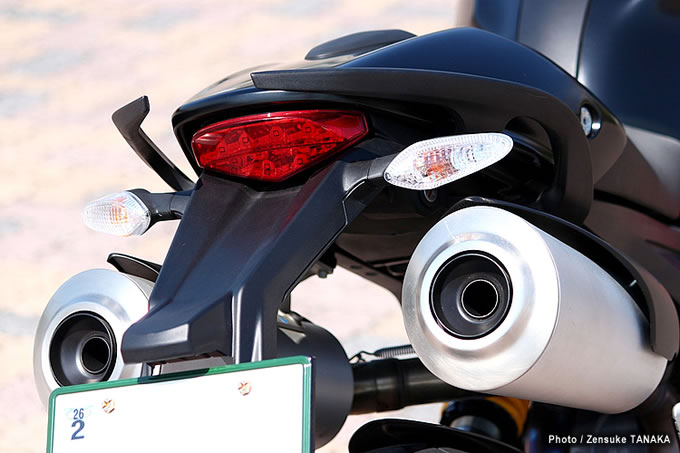 03アップタイプの左右2本出しアルミサイレンサーは他のモンスターシリーズと共通のデザイン。ショートタイプだが十分な容量を確保しつつ騒音と排気ガス規制に対応している。LED専用デザインのテールライトユニットは光度を高める特殊拡散レンズを採用。
