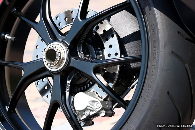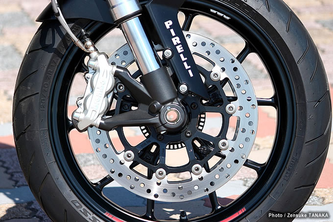 04フロントブレーキはφ320mmダブルディスク&4ピストンタイプのラジアルマウントキャリパーを装備し、強力かつコントローラブルな制動力を発揮。日本仕様には標準装備となるABSは通常のタイプより自然なフィーリングを重視した設定となっている。