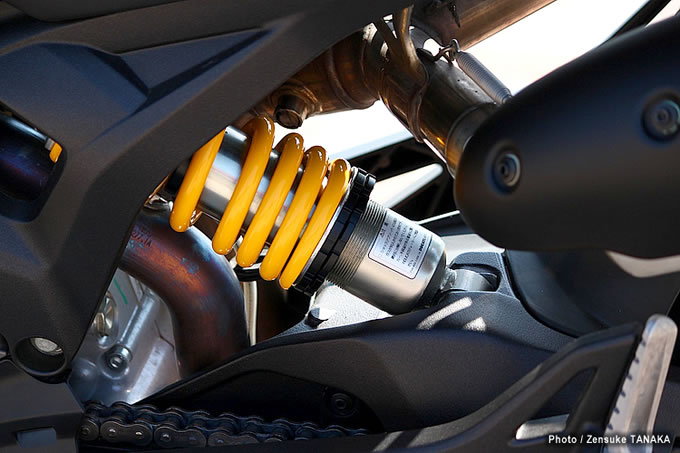 06リアショックはザックス製アジャスタブルタイプで、プリロードと伸び側減衰力の調整が可能。アルミ製片持ち式スイングアームにリンクを介さず直接マウントされる。ちなみにフロントフォークは調整機構を持たないショーワ製φ43mm倒立タイプを採用。