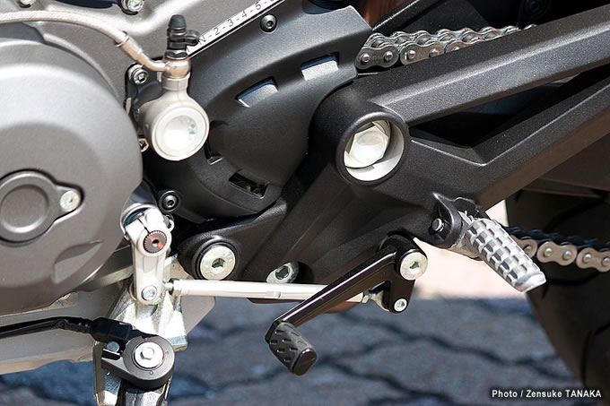 08アルミ製ステップバーは深いローレットが刻まれていて、滑りにくくステップワークしやすいデザイン。シフトペダルの形状も独特で、先端のペグ部分に角度がつけられているため確実にシフト操作しやすい。