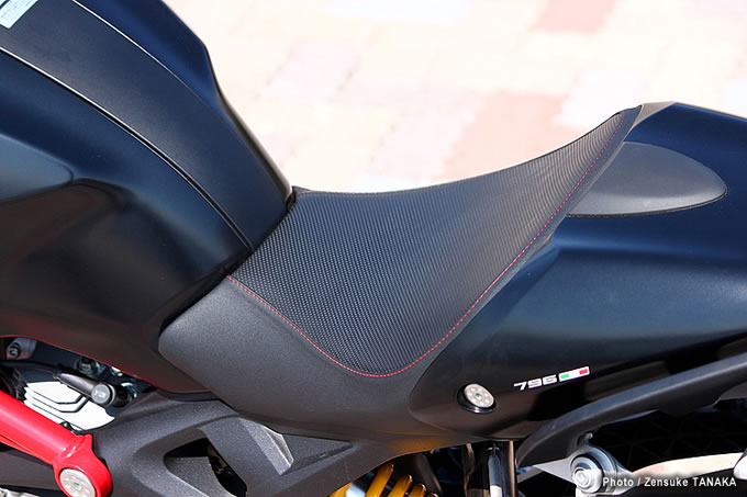 09レッドステッチのアクセントが美しいシートは、エルゴノミクスに基づく新しい形状を採用。796にはイタリアの国旗をあしらったスポーティなシングルシートカバーが標準装備される。