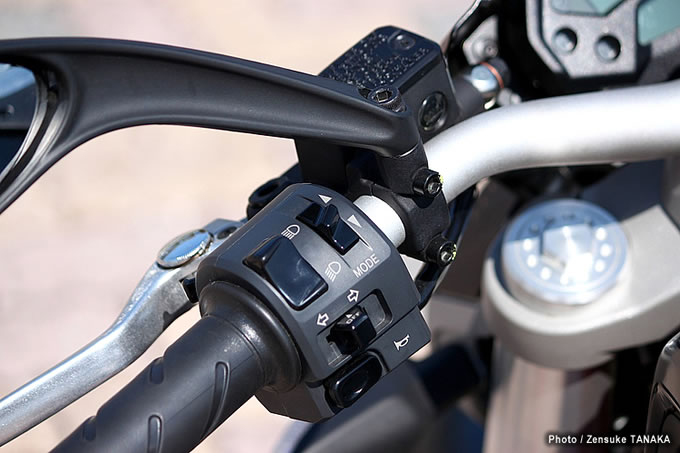 11ハイビームフラッシュボタンで操作できるストップウォッチ機能のほか、モードスイッチを操作して機能画面の表示を切り替えることもできる。また、現行の696と同様、クラッチ側、ブレーキ側ともアジャスターを装備し、レバー位置を4段階で調整できるように改良されている。