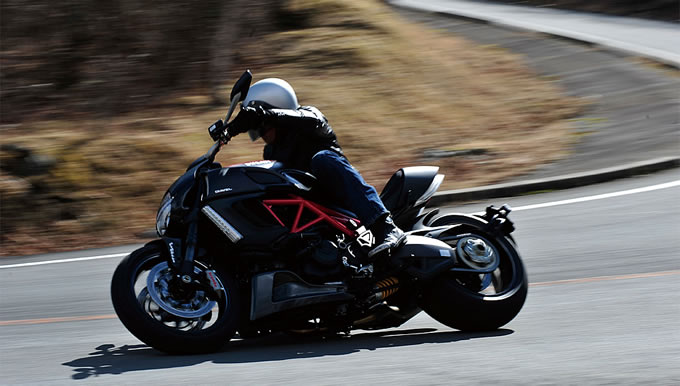 ディアベルの低いシートと上体がリラックスしたポジションは、ハイスピードからのブレーキングでも恐怖感が少ない。前にあるステップに踏ん張り、盛り上がったタンクで体が前にいかないようにすればハードブレーキングも安定している。下り坂などはセパハンのロードスポーツが可哀想になるくらい楽に走れる。ということはつまりコーナリングで最も重要なバンキングの時点で気持ちに余裕ができるということ。これ、ライディングでとっても大きな武器。