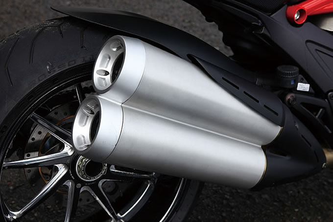 マシンを前にすると、やっぱり異様。マシンがでかいということもあるのだが、内臓が飛び出してしまったようなマフラーとかリア周りの造形とか、えらくインパクトがある。ノペッとしたボティからステアリングが飛び出している様子は、バイクという感じがしない。跨がってみるとシートの低さに驚く。両足ベッタリ。ハーレー級に低い。他メーカーなら「いいねえ」と思うのだが相手はドゥカティである。今まで何よりも運動性一番で作られたマシンは、どれも相応のシート高になっていた。