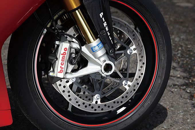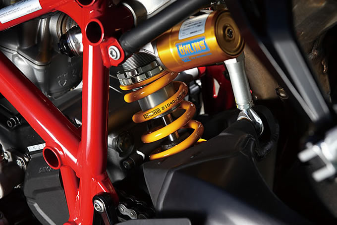 1198SPにはオーリンズ社のTTXショックユニットが採用されている。レースシーンにて活躍するこのサスペンションは、圧側、伸び側の減衰力をそれぞれ独立した形で調整でき、セッティングの幅がとても広い。