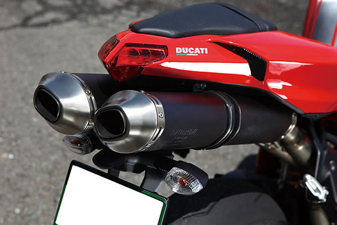 触媒コンバーターとラムダセンターを装備するエキゾーストシステムは、0.8mm厚の極薄素材を使用し超軽量なものとなっている。シート下から奏でられるLツインのレーシングサウンドは、惚れ惚れする音色だ。