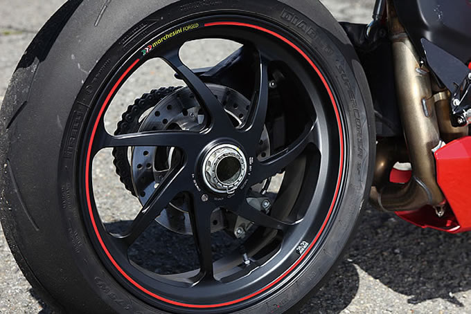 SPグレードにだけ採用されるマルケジーニ製アルミニウム鍛造ホイール。軽量かつ高剛性を誇る。190/55ZR17サイズのリアタイヤを履き、しっかりと路面を捉えつつパワースライドはDTCで制御する。
