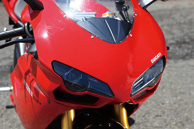 タンブリーニがデザインした916の直系と言えるスタイリングになった1198。WSBKで活躍するDUCATIの顔となっている。なおライトケースは旧型となる1098と比べ0.4kg軽量化されている。