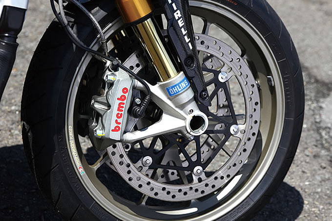 オーリンズ製サスペンションやマルケジーニホイールなどのハイエンドパーツを装着するストリートファイターSに対して、ショーワ製フロントフォークと同リアサスペンション、10本スポークの軽量アルミホイールを装備するのが、通常ラインのストリートファイターである。