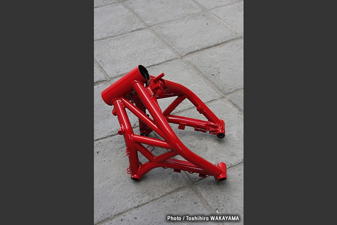07トラスフレームは、従来のようにクランクケースではなく、前後気筒のシリンダヘッドで支持される。そのため、トラス部が小さく、重量も 1.23kg 軽量である。また、エンジンをより有効に剛性部材として利用したことで、エンジン込みでのねじり剛性は、ほぼ2倍に高められた。