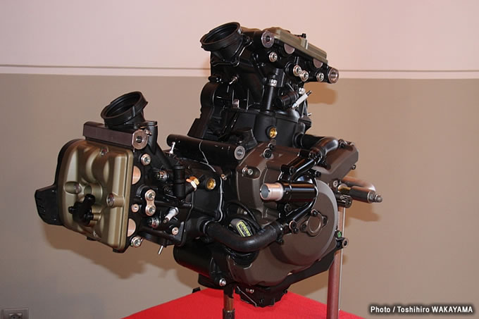 08吸排気バルブのオーバーラップ角を小さくしたテスタストレッタ 11°は、第二世代に進化。インジェクターの装着位置を、高温の吸気バルブ裏側に移動。燃料をバルブに向かって噴射し、気化状態を均一化し混合気を細密化することで、燃焼効率を向上。また、デュアルスパークとしている。