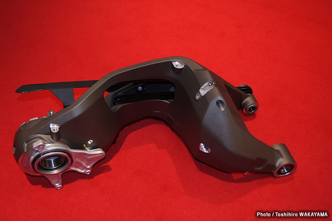 09スイングアームは、アルミダイキャストの片持ち式で、従来型となるモンスター 1100 EVO よりも、見るからにロングアーム化されている。