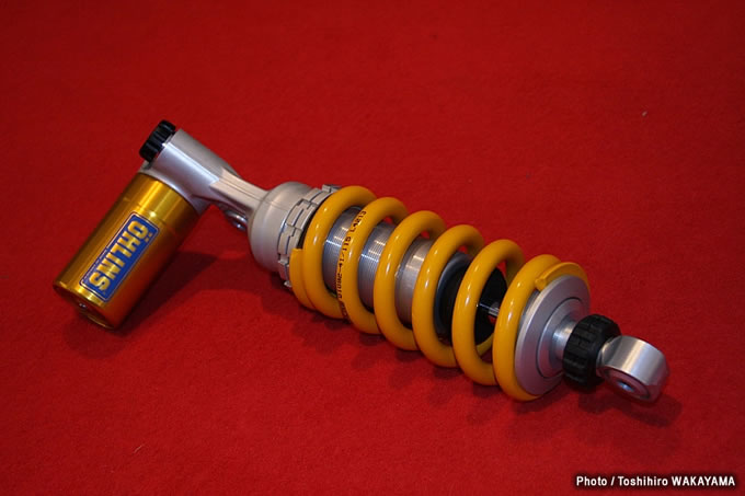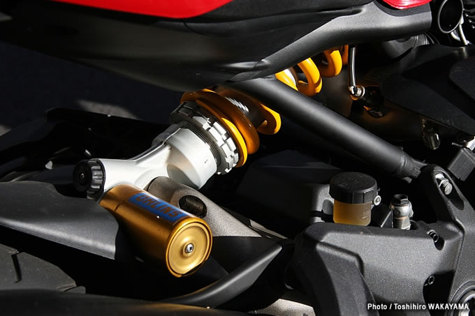 10リアサスペンションは、リンクを持たずスイングアームからダイレクトに作動。後方気筒のシリンダヘッドで支持される。モンスター 1200 S のユニットはオーリンズ製のリザーバータンクを一体化した独自のピギーバックタイプ。モンスター 1200 はザックス製だ。