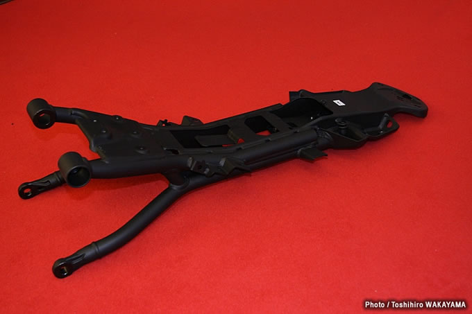 11単体で 1.10kg と軽量のリアフレームも、エンジンで支持される。軽量コンパクト化のための合理的な設計だ。